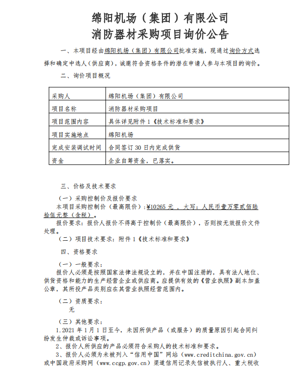 綿陽(yáng)機(jī)場(chǎng)(集團(tuán))有限公司 消防器材采購(gòu)項(xiàng)目詢價(jià)公告